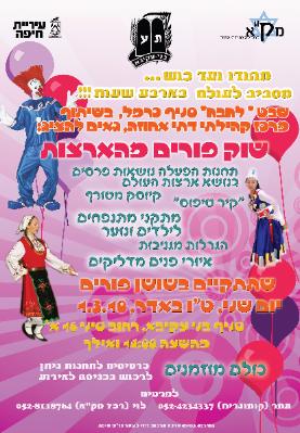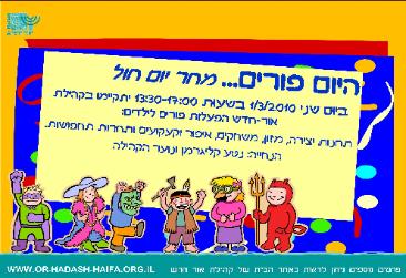 | Exhibits and activities On March 15, 19:00, The Visible and the Hidden at Hadar, interactive exhibition of photographs at the Tiberias Community Center in Hadar and along Masada street until April 5, Haifa Haifa museums 1599 50 22 11 Haifa Art Museum Paper works, 8523255, Haifa Art Museum Pirates Museum-National Maritime Museum: The pirate, the flag, and the skull, Cinematrix Madatech, Museum of Science, Technion Historic Building, Hadar Madatech Observe birds at Lake Hula, 6937069 The country of Marzipan, Marzipan Museum, 6772111, Kfar Tavor Chocolates at Galita, 6755608, Kibbutz Degania Maabadada, interactive exhibit, interdisciplinary creativity, Janco Dada Museum, 9842350, Ein Hod On the footsteps of kangaroos and koalas, Gan Guru, 6488060, Kibbutz Nir David Tour of the kibbutz in a little train, reservations 0545658821, Kibbutz Ein Gev The magic of photography, guided tour for parents and children of August Sander's exhibit, photography workshop where children learn how to develop photographs in a darkroom, Open Museum of Photography, Tel Hai Industrial Park History of illustration, drawings for famous children books by Sharon Alpert, Library, Kibbutz Afikim Shows, theater, puppets etc... On March 1, 10:00, 12:30, 16:00, Europe Circus, Hutsot HaMifratz On March 1, 10:30, The tractor in the sandbox, Tikotin Museum of Japanese Art, Haifa On March 1, 11:00, Animals and Masks, Creations of silk masks representing various animals (6-12), Haifa Museum of Art On March 1, 11:00, Creative workshops, Open Museum of Photography, Tel Hai On March 1, 11:30, The flag and the skull, visit of the pirates museum, Creative workshop: treasure box, ship in a bottle, National Maritime Museum, Haifa On March 1, Purim at the Kyrion, Assaf Ashter and Gur Woch, information 057 4449999/2147, Kanyon HaKyrion, Kiryat Bialik On March 1, 13:30-17:00, Purimon, games, costumes competition, workshops, Or Hadash Synagogue, Haifa On March 1, 14:00-17:00, Merkaz Kehillati Dati Achuza (MAKA) – The Ahuza Orthodox Community Center and Bnei Akiva Achuza, "Purim Carnival" for the entire family, Reservation not necessary, simply come along and join the fun… (if you'd still like to find out more info, feel free to contact Levi Smith,0528118764. Happy Purim! On March 1, 14:30, Peter Pan, staged by Tzvia Huberman, choreography by Eldad Grossman, produced by the Haifa Municipal Theater with the Orna Porath Theater for Youth, Haifa Municipal Theater On March 1, 17:00, Otsli gotsli, after the brothers Grimm, translated by Abraham Shlonski, staging by Roni Pinkowicz produced by the Cameri, Motzkin Theater, Kyriat Motzkin ♫On March 1, 17:00, The New Haifa Symphony Orchestra, Petite suite series, Incognito, introduction to Concert no. 3 from the ClassicKids Series "The king's Trumpets", Meet wind section musician Jeffrey Howard and Pianist Daniel Kruglove,Dunie Weizman Conservatory of Music Haifa Symphony Subscription holders and Conservatory students - Free admission. Guests admission fee - 10 NIS. Conservatory address: 12 Bezalel St, Hadar - Haifa Ticket reservations: Tel - 8626014 Please present your subscription card or conservatory student card., Dunie Weizman Conservatory of Music, Haifa On March 1, 17:00, Travel in a box, danse and choreography by Nima Jacoby, Community Center, Binyamina On March 6, 10:00, 12:30, 16:00, Europe Circus, Hutsot HaMifratz On March 6, 11:00, Saturdays for the whole family at the Cinematheque, Family has the Cinematheque, Projection: the Wild Things Are, Maurice Sendak to after, from Spike Jonze, Cinematheque, Haifa ♫On March 6, 11:30, The Haifa Chamber Music Society, Concert No. 24, Magical sounds with Niza Shaul, Dances of the city and sounds of the village, Bela Bartok, Rappoport auditorium, Haifa ☺On March 6, 11:30, The Magic Pumpkin, written and directed by Ofer Shafrir, HaTsafon Theater, Kyriat Haim On March 6, 11:30, Cinderella, Ilanit Levi, directed Roe Segev, Motzkin Theater, Kiryat Motzkin On March 7, 19:00, Annie, after the book by Thomas Meehan, music by Charles Strouse, produced by the National Touring Production, Beit Nir, Zichron Yaakov ♫On March 8, 17:00, The New Haifa Symphony Orchestra, Klassikids series,The king's Trumpets, Aviv Ron, Conductor, Arik Davidov, Trumpet, The amusing story of a trumpet player who accepted a job at the king's court, Rhymed Classical music for children introducing the trumpet, Krieger auditorium, Haifa On March 8, 17:30, Bentzy, after Elmer the elephant, by David Mc Kee, Performance Hall, Kibbutz Gan Shmuel On March 9, 17:00, Story time, the monkey's birthday told by Orna Forna, Library, Beit Heine, Haifa On March 9 17:00, Story time, Saba mebulbalia, by Irit Weismann, songs by Sonia Kaplan, Library, Beit Nagler, Kyriat Haim ♫On March 10, 17:00, The New Haifa Symphony Orchestra, Klassikids series,The king's Trumpets, Aviv Ron, Conductor, Arik Davidov, Trumpet, The amusing story of a trumpet player who accepted a job at the king's court, Rhymed Classical music for children introducing the trumpet, Beit Nagler, Kyriat Haim On March 10, 17:30, A show for children: Cinderella, Krieger, Haifa On March 10, 19:30, Annie, Annie after the book by Thomas Meehan, music by Charles Strouse, produced by the National Touring Production musical in English, Rappoport Hall, Haifa On March 11, 17:00, Story time, Enchanted trip in music and stories by Emmanuel Almosnino, mediatheque, Romema, Haifa On March 13, 10:00, 16:00, Europe Circus, Hutsot HaMifratz On March 13 , 11:00, Yeled Paam, stories and songs for the little ones, nostalgia for the grown ups , the Beat, Haifa On March 16, 17:00, Story time, The legend of the King, narrated by Meirav Cnaan-Berkowicz, S Shalom Library, Haifa On March 16, 17:00, Story time, The Ugly Duckling, storytelling by Vered Stavinski, Neve David library, Haifa On March 16, 17:00, Story time, The darkness that had disguised with Irit Weizman and singer Sonia Kaplan, Kiryat Eliezer Library, Haifa On March 16, 17:00, Story time