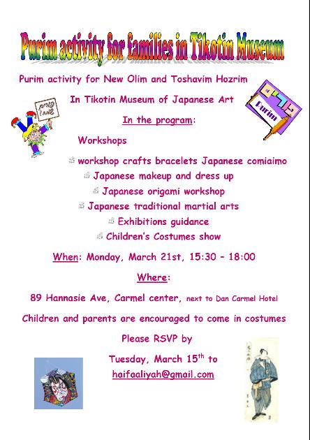 | Trips, Excursions, nature See at the end of the page Museums exhibits and activities Haifa museums 1599 50 22 11 Haifa Art Museum Window on reality, interactive exhibit for all ages, 8523255, Haifa Art Museum Pirates Museum-National Maritime Museum: The pirate, the flag, and the skull, Cinematrix Madatech, Museum of Science, Technion Historic Building, Hadar Madatech Hai Park, Kyriat Motskin Zoo, Haifa Observe birds at Lake Hula, 6937069 Meet the birds 9:00, 11:00,Botanical Gardens, Oranim Academic College, 1800-301080, Kyriat Tivon The country of Marzipan, Marzipan Museum, 6772111, Kfar Tavor Chocolates at Galita, 6755608, Kibbutz Degania Maabadada, interactive exhibit, interdisciplianary creativity, Janco Dada Museum, 9842350, Ein Hod On the footsteps of kangaroos and koalas, Gan Guru, 6488060, Kibbutz Nir David Tour of the kibbutz in a little train, reservations 0545658821, Kibbutz Ein Gev The magic of photography, guided tour for parents and children of August Sander's exhibit, photography workshop where children learn how to develop photographs in a darkroom, Open Museum of Photography, Tel Hai Industrial Park History of illustration, drawings for famous children books by Sharon Alpert, Library, Kibbutz Afikim Shows, theater, puppets, stories etc... On March 1, 17: 00, Story time, in district libraries: Neve David, Cultural Center of Religious Neve Sehanan, Romema,, Shprintzak, Yad Lebanim, Kiryat Eliezer, Haifa and Beit Nagler and Beit Heine, Kiryat Haim On March 1, 17: 30 In our yard, with Rinat Gabai, Yad LeMeginim, Kibbutz Yagur On March 2, 17: 30, Apartment for Rent by Lea Goldberg, adaptation and staging of Galia Beeri, choreography by Limor Korkin, produced by the Mofa Theatre, Eshkol Payis Misgav, Misgav On March 5, 11:00, The Princess and the toad, after the brothers Grimm, HaTsafon Theatre, Kiryat Haim On March 5, 11: 00, Shabbatarbut for the whole family, modeling, Center for the Arts, Haifa Museum of Art On March 5, 11: 30, Puppet Theatre, Sound of the bell, by Shiran Carmeli, Beit 9, Campus HaNamal, Haifa On March 5, 12: 00, The Man and the line, story, handicraft and guided visit of the museum, Tefen Open Museum, Tefen Industrial Park On March 5, 12: 30, Berale Kids, Magical Mystery Tour, a tribute to the Beatles, Berale, Kibbutz Lehavot Haviva On March 6, 17: 30 With us in our backyard, with Rinat Gabai, Kiryat Atta Theatre On March 7, 17: 30 When the month of Hadar enters, community event for Purim show of magicians, making rattles, Beit Fanny Kaplan, Shaar HaAlyia, Haifa On March 7, 17: 30 With us in our backyard, with Rinat Gabai, Kiryat Atta Theatre On March 8, 17: 00, Story time, The miller's daughter told by Uri Friedman, Library, Beit Heine, Kiryat Haim On March 8, 17: 00, Story time, The brave flutist, by Emmanuel Almoznino, Library Shalom S, Neve Sheanan, Haifa On March 8, 17: 00, Story time, Flower-heart of gold, told by Yaron Sancho Goshen, Minz Library, Merkaz HaCarmel, Haifa On March 8, 17: 30, With us in our backyard, with Rinat Gabai, Kiryat Atta Theatre On March 8, 17: 30 A strange story about the seasons of the year, by Gil Tchernowicz, staging by Roe Segev, produced by the Mofa Theatre, Cultural Center, Nesher On March 8, 17: 30 Saba Tuvia’s animals stories, with Tuvia Tsafir, Beit Abba Hushi, Haifa On March 9, 17: 30, Yuval HaMebulbal, the star of wishes, Motzkin Theatre, Kiryat Motzkin On March 9, 17: 30, With us in our backyard, with Rinat Gabai, Kiryat Atta Theatre On March 10, 17: 30, Music Box, by Galia Beiar, choreography of Moria Zaccharia, produced by the Mofa Theatre, Cultural Center, Karmiel On March 12, 11: 00, Handicraft workshop, pirate ship, Pirate Museum (National Maritime Museum), Haifa On March 12, 11: 30 Saba Tuvia ‘s animal stories , with Tuvia Tsafir, HaTsafon Theatre, Kiryat Haim On March 12, 11:00, Confection of granola, 12:00, walk in the fields of aromatic and medicinal plalnts, handicraft with spices, Spice Farm, BeitLechem HaGlilit On March 12, 12: 30, Snow White and the Seven Dwarfs, the Israel flamenco company, COMPASS, choreography by Michal Nathan, Berale, Kibbutz Lehavot Haviva On March 12, The Haifa Chamber Music Society , Magical Sounds , with Nitza Shaul, The Piano King's birthday, Frederic Chopin, Rappoport Hall, Haifa On March 14, 17:30, Sounds in the tunnel of time (4-9) Yad LeMeginim, Kibbutz Yagur On March 15, 16: 30, Circus of cubes, by Galia Levi Grad, produced by the HaKaron Theatre, Beit HaTotchan, Beit Nir, Zichron Yaakov From March 17 to 21, 9 :00-17: 00, Purim in the Valley of Jezreel, Honey flavored Purim banquet at Dvorat HaThabor, visit the observatory of honey production, free admission for children dressed as bees, 04-6769598, 050 - 5637645, Moshav Shadmot Tabor From March 17 to 21, 9 :00-16: 00, Sunday-Thursday, Purim in the Valley of Jezreel, Tnuva dairies, dairy products from the reception of milk to the sending of the finished product. On the occasion of Purim, free admission for families of those whose disguise is about milk: cow, dairy farmer, Cottage, etc.. (A maximum of four tickets, to the reception center also including the visitor center in Rehovot)) visits by appointment only, bookings and information 04-6408140. Alon Tavor From March 17 to 21,-10:00, Purim in the Valley of Jezreel, Jeep Tours, hiking and nature walks, with Jeep Bakfar jeeps or private jeeps, of Moshav Kfar Baruch, costume contest. Hiking for two hours or for a full day, contact: 04-6546917, 054-7691895, Kfar Baruch From March 18 to 21, -10: 00, Purim in the Valley of Jezreel, Teioulatron - Purim Hiking, Walks with families, in green landscape and nature, four short pieces evoking biblical figures. Instructions and challenging puzzles for children (6 +) and the whole family. Register in advance as a group (minimum 10 families - 35 participants) (journey time approximately three hours by car) 050-4674077 From March 18 to 21, Purim in the Valley of Jezreel, Feast of Purim at the Spices Farm Special workshops for chil