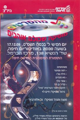 | En septembre Pour les enfants Pour tout public Le 1er septembre, 20:00, Bonsoir le monde, Conférence de Yoel Shtrug, Paris, Les feuilles mortes, Musée Tikotin d'Art Japonais Le 1er septembre, 20:30, La vie devant soi, de Emile Ajar (Romain Gary), mise en scène de Itsik Weingarten, produit par HaBima, Theatre HaTsafon ♫Le 1er septembre, 20:30, La Societe de Musique de Chambre de Haifa, Tsvi Plesser et Hillel Zori, avec les violonistes Gai Bronstein, Yael Brolski, et les altistes uri Kam et Amichai Gross, Bach suite pour 2 celli, Bethoven septuor, Brahms sextuor a cordes en si b maj, auditorium Rappoport Le 2 septembre, 17:00, Testaments et heritages, conference de Me Iris Ontchik, Centre communautaire Yad LeBanim Le 2 septembre, 20:30, La vie devant soi, de Emile Ajar (Romain Gary), mise en scène de Itsik Weingarten, produit par HaBima, Theatre HaTsafon Le 2 septembre, 21:00, L'endroit d’où je viens, de David Mamet, mise en scene de Moshe Naor, produit par le Theatre Municipal de Haifa, Scene 3, Theatre Municipal de Haifa Le 3 septembre, 20:00, Par dela l'archet, Le quatuor Carmel, Dvorak, voyage au nouveau monde du compositeur Tcheque a travers le le quatuor americain, Musee Tikotin d'Art Japonais Le 3 septembre, 20:30, La vie devant soi, de Emile Ajar (Romain Gary), mise en scène de Itsik Weingarten, produit par HaBima, Theatre HaTsafon Le 3 septembre, 20:30, Le marche aux bonnes affaires, poèmes et chants de Nathan Alterman, produit par le Théâtre Municipal de Haifa, Théâtre Municipalde Haifa Le 4 septembre, 21:30, La vie devant soi, de Emile Ajar (Romain Gary), mise en scène de Itsik Weingarten, produit par HaBima, Theatre HaTsafon Le 4 septembre, 22:30, Adir Miller, stand-up, Beit Nagler Le 5 septembre, 21:00, La vie devant soi, de Emile Ajar (Romain Gary), mise en scène de Itsik Weingarten, produit par HaBima, Theatre HaTsafon Le 5 septembre, 21:00, Coutures, de Anthony Nelson, produit par le Theatre Municipal de Haifa, Theatre Municipal de Haifa et le Theatre Tmuna, Scene 2, Theatre Municipal de Haifa Le 5 septembre, 21;00, La Societe de Musique de Chambre de Haifa, Club du Baroque, Dvorah Barak, flutes, Nitai Zuri, violon baroque, Miri Zinger, clavecin, trios, sonates baroques d'Allemagne et d'Italie, Bach, Handel, Telemann, Geminiani, Vivaldi, le Studio Le 6 septembre, 20:00, Quand le peuple d'Israel se met en echec, conference du Dr Abraham Wolfenson, La haine des freres de Joseph ammene l'esclavage en Egypte, Centre communautaire Yad LeBanim Le 6 septembre, 20:30, Hazanim et ame juive, par le Theatre du Yiddishspiel, avec les Hazanim Israel Rand, Shlomo Glick, Yichezkiel Kleng, le chanteur d'opera Gay Manheim, accompagnes de l'Ensemble HaBritonim, presentation et narratif par Shlomi Goldberg, Theatre HaTsafon Le 7 septembre, 10:30, Le Club de Culture, series de conferences sur la culture et l'art, Journee ouverte, rencontre avec les conferenciers, Musée Tikotin d'Art Japonais Le 7 septembre, 20:00, L'Empire britannique, conference du Dr Avihu Bar Eyal, Construction de l'Empire, Centre communautaire Yad LeBanim Le 7 septembre, 20:30, Anda, ecrite et mise en scene par Hillel Mittelpunkt, produit par Beit Lessin, Theatre HaTsafon Le 7 septembre, 20:30, L'affreux, de Marius von Meyenbourg, mise en scene de Ari Remez, produit par le Theatre de Haifa, Scene 3, Theatre Municipal de Haifa Le 8 septembre, 11:00, Securite sur la route pour les seniors, conference de Or Yarok, Centre communautaire Yad LeBanim Le 8 septembre, 20:30, Anda, ecrite et mise en scene par Hillel Mittelpunkt, produit par Beit Lessin, Theatre HaTsafon ♫▌♪▌ ▌ ♪ Le 8 Septembre, 20:30, Le Nouvel Orchestre Symphonique de Haifa, Série Big band, Haifa-Chicago transit, Avi Leibovich, chef d'orchestre et arrangements, Alessandro Lanzoni, Piano, Le Jazz band de Haifa, Krieger Center Le 9 septembre, 20:00, Eretz Israel en histoires et en musique, conference de Nati Goldberg, Les 100 ans de Tel-Aviv, Centre communautaire Yad LeBanim Le 9 septembre, 20:30, 17ע' – , de Shay Lahav et Yoni Zikholtz, mise en scene de Noam Shmuel, produit par le Cameri, Theatre Municipal de Haifa ♫▌♪▌ ▌ ♪ Le 9 Septembre 20:30, Le Nouvel Orchestre Symphonique de Haifa, Série Big band , Haifa-Chicago transit, Avi Leibovich, chef d'orchestre et des arrangements, Alessandro Lanzoni, Piano, Haifa Le Jazz band de Haifa , Theatre HaTsafon Le 10 septembre, 19:30, Plume et encrier, lecture des oeuvres ecrites par les participants au groupe de creation litteraire 2009, suivi d'un debat sur la creation litteraire anime par Tsvia Furer, Centre communautaire Yad LeBanim ♫▌♪▌ ▌ ♪ Le 10 Septembre, 21:00, La Societe de Musique de Chambre de Haifa, Club de jazz, Voix et sons de Bossa nova, avec Tanira da Silva, et Uri Bracha, chant, Tom Peleg, basse, Gonen Rosenberg, tambours, le Studio Le 10 septembre, 21:00, Le couple bizarre, de Neil Simon, mise en scene deMoshe Naor, produit par HaBima, Theatre HaTsafon Le 11 septembre, 22:00, Gidi Gov, Theatre HaTsafon Le 11 septembre, 22:00, Club de la chanson, Kol HaKavod, Yehoram Gaon, tous les succes de son repertoire, direction musicale Uri Kariv, Beit Abba Hushi Le 12 septembre, 19:30, Le club de chant, mille et une chansons, accompagnement par Moshe Weiss, chants pour la nouvelle annee, Centre communautaire Yad LeBanim Le 12 septembre, 20:30, La Societe de Musique de Chambre de Haifa, Concert no 1 celebration des 60 ans de la Societe, Salle Rappoport Le 12 septembre, 21:00, Coutures, de Anthony Nelson, produit par le Theatre Municipal de Haifa, Theatre Municipal de Haifa et le Theatre Tmuna, Scene 2, Theatre Municipal de Haifa Le 12 septembre, 21:30, Le couple bizarre, de Neil Simon, mise en scene deMoshe Naor, produit par HaBima, Theatre HaTsafon Le 13 septembre, 19:30, Merveilles du monde, geographie, conference de Ayelet Eilandberg, Dieux et demons, Centre communautaire Yad LeBanim Le 13 septembre, 20:30, La Camerata Israelienne de Jerusalem, Foire de l'Es