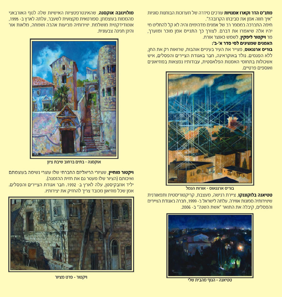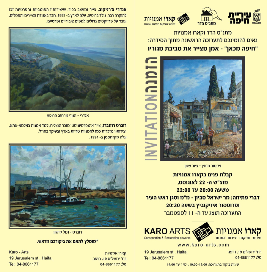 Exhibits, workshops, guided visits, museum Haifa museums 1599 50 22 11 Haifa Art Museum Israel art guide Galleries at Ein Hod O * GE Gallery, butterflies, eco cars, From January 30 to March 28, Voice of Haifa, photographs on radio Haifa O * GE Gallery, HaNamal 35, Haifa "Passover in the Print of Art", Opening on March 21, 19:00, National Maritime Museum, Haifa Body Worlds, exhibition designed by Gunther Von Hagen featuring preserved cadavers in order to show the complexity of human anatomy, very controversial exhibition, opening April 6, Madatech, National Museum of Science, Technion Historic Building, Haifa Contract in the desert, drawings and paintings by Shoshana Heiman, opening May 2, 19:30, Hecht Museum, University of Haifa Sitting on the horizon, drawings and sculptures by Shoshana Heiman, opening May 2, 17:30, Wilfrid Israel Museum, Kibbutz Hazorea Artists from Honduras, group exhibition, opening on May 2, 18:00, Karo Art Gallery Paper works of art collections and ethnological museums of Haifa as well as commissioned works, paper cuttings from many countries, China, Japan, Mexico, Holland, etc. prints, engravings, and contemporary works. The Center for the Arts turns into a space of exhibition and creation. Center for the Arts, Museum of Art Haifa The art of love, of the Shunga Collection Ofer Shagan, opening June 6, 19:00, Tikotin Museum of Japanese Art Prints by great Japanese artists, opening on June 6, 19:00, Tikotin Museum of Japanese Art, Haifa Annual exhibition of painters and artists from Haifa and the North, presenting Baruch Zaltz, opening 13 June, 11:00, Beit Chagall, Haifa Personal impressions on the second Lebanon war, photographs by Mayan Bloch, opening June 15, 18:00, Beit Yad LeBanim, Haifa Enlarging the heart, mixed media, group exhibit, opening June 10, closes July 12, Open Museum of Photography, Industrial Park, Tel Hai Trace and place, paintings and engravings by Hava Law-Yone, opening on June 29, Beit Gabriel, Galilee Lake, Tsemach junction Ephemeral passage, drawings by Orit Hofshi, opening June 27, Tefen Industrial Park Excessive exaggeration, grotesque in modern art, curator Tami Katz Priman, opening on July 18, 20:00, Haifa Museum of Art Large little flower, by Nira Shcwartz, Opening on July 1st, 11:00, auditorium, Haifa Sport in motion, bronze sculptures by Daniel Baharia, opening on July 5, Canada Centre, Metulla Independent work, mixed media, group exhibit by 45 artists, opening July 11, Beit Urin and Rami Nechushtan Museum, kibbutz Ashdod Yaakov Winter rain, paintings and sculptures by Elad Armon, opening July 24, 20:30, Gallery, Kibbutz Mishmar Haemek Embody, photographs and video by Nir Hertog and Chaya Nadler, Loot I, by Guy Goldstein II, mixed media, Army of lovers paintings by Raphael Perez, opening on August 8, 12:00, Janco Dada Museum, Ein Hod Haifa seen from here, group exhibit by 6 Haifa painters, opening on August 22, 19:00, invitation: part 1 part 2Caro Gallery of Art, Haifa Magic dolls, annual exhibition of artisitic dolls, August 22-30,Beit Hecht Ottman Haifa: Aspects of the City, 1516-1918, Hillel Ran curator, opening on August 29, 20:30, Museum of the City of Haifa On August 8, 11:30, Sailors as creators, guided tour and workshop, Pirates Museum-National Maritime Museum, Haifa On August 8, 11:30, Visit of the exhibition Disproportionate Exaggeration and discussion, Haifa Art Museum On August 13, 18:00, Workshop, drawing after a model, Center for the Arts, Musee d'Art Haifa Theater, Dance, Shows, Conferences On August 1, 12:00 "A Flower in the Galilee", A midday concert for the whole family, Kibbutz Eilon On August 1 , 12:30, 60Hz, by the Kibbutz Dance Company, choreography by Rami Beer, Kibbutz Gaaton On August 1, 19:00-23:00, Folk dances and dances in a row on the beach, Dado Promenade, Haifa On August 1, 19:30-23:30, Folk dances and dances in a row on the beach , Naot Promenade On August 1, 20:15, "A Russian Adventure", A concert of works by Russian composers, Kibbutz Eilon On August 1, 21:00, The life ahead of us, by Emile Ajar (Romain Gary), directed by Itsik Weingarten produced by Habima, HaTsafon Theater On August 1 , 21:00, Was it a dream? by Edna Mazya , directed by Omri Nitzan, produced by the Cameri, Theater, Kiryat Motzkin On August 1 , 21:00, Overtone, tribute to the Beatles, Elephant Pub, Kyriat Haim On August 1 , 21:00, Sallah Shabati, musical comedy after the film by Ephraim Kishon, directed by Moshe Kepten produced by the Cameri, Cultural Center, Kiryat Motzkin On August 2, 18:30, Tai Chi, with Shimon Harpaz, beach Kiryat Haim On August 2, 20:30, Scenes of conjugal life, adapted from the film by Ingmar Bergman, directed by Rami Hoyberger, produced by Habima, HaTsafon Theater From August 2 to 8, Kol HaMusika Festival in Galilee, Kfar Blum On August 2 , 20:30, Was it a dream? by Edna Mazya , directed by Omri Nitzan, produced by the Cameri, Theater, Kiryat Motzkin On August 3, 10:30, Lecture by Roe Aloni, Romeo and Juliet in classical music, Tikotin Museum of Japanese Art, Haifa On August 3, 19:00-20:00, Activities and Tai-chi, Dado beach, Haifa On August 3, 20:00, Hazanim and the Jewish soul, directed by Yoel Zilberg, by the Yiddishspiel Theater with Hazanim Rand Israel, Shlomo Glick, Yichezkiel Kleng, opera singer Gay Manheim, accompanied by the HaBritonim, presentation and narrative by Shlomi Goldberg, HaTsafon Theater, Kyriat Haim On August 3, 20:15, A lecture and demonstration by Cihat Askin about the French School of Violin Playing and the formative influence of composer and violinist Rodolphe Kreutzer , Kibbutz Eilon On August 3, 20:30, Stellos and Oren Hen, Beach, Kiryat Haim On August 3 , 21:00, Singing Meir Ariel, 10 years without him, with Ehud and Shahar Ariel, Meir Banai, Tamuz, Achinoam Nini , Gil Dor, Alma Zohar, Shalom Hanoch, Moshe Levy, Dan Toren, Ninette Tayeb, Marina Maximilian Blumin, Dikla, Ronit Shahar, Efrat Gosh, Shlomo Saranga, Ariel Zilber, Dori Ben Zeev, Rami Kleinstein ... amphitheater, Caesarea 