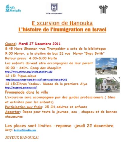 | Du 28 novembre au 2 decembre, Festival Doc Aviv Galilee, sur la “peripherie” geographique et sociale en Israel, projection de documentaires, ateliers, discussions, Maalot Tachshicha Du 1er au 8 decembre,Institut Bucerius, en cooperation avec le departement de musique de l'Universite de Haifa ,Prof. Jörn Peter Hiekel / Lucas Fels, La musique contemporaine pour violoncelle en Allemagne, conferences, masterclasses et recital de violoncelles par Lucas Fels, Universite de Haifa Les 2 et 3 decembre, Week-end d'hiver du Festival de l’echelle de Jacob, folk, rock, musique et danse, Hotel Nof Ginossar, Lac de Tiberiade Le 3 decembre, -10 :00, Foire des jours de Binyamina, objets d’art et de collection, brocante, meubles retro, vintage, HaMoshava, Binyamina Le 4 decembre, 20 :30, Lancement de la chaine Francaise RFI en Israel, retransmission de l’Institut Français de Tel-Aviv, Yes 71, Hot 87 La Fete des fetes a Haifa, Hag shel Hahagim-Haifa 2011 Haifa fete les fetes Juives, Musulmanes et Chretiennes les vendredis et samedis 2 et 3, 9 et 10, 16 et 17, 23 et 24 decembre, les vendredis 10:00-16:00 et samedis 10:00-19:00, Beit HaGefen, Haifa manifestations, evenements, expositions, promenades guidees, spectacles, theatre, gastronomie, musique, concerts de musique lithurgique, parades, salon des antiquaires, hospitalite a la maison du Pere Noel, marche aux flambeaux, chaque week-end en decembre (jeudi soir, vendredi, samedi) Beit HaGefen, Scene Centrale rue Wadi, et dans toute la ville , Haifa Le 1 décembre, 20:30, Fete des Fetes-Haifa, Vernissage des expositions dans les galeries et les musées dans toute la ville, Haïfa Salon national des antiquaires Oeuvres d'art dans les rues, expositions dans les musees, studios ouverts En cas de pluie, veuillez appeller le 106 pour etre informes des changements Le 6 décembre, 9:30, Earth2space, De la Terre à l'espace, Conférence israélo-italienne sur les technologies spatiales, en présence du ministre des Sciences et de la Technologie le Professeur Daniel Hershkowitz et de Son Excellence l'ambassadeur italien Luigi Mattiolo. des représentants de l'Agence spatiale Italienne, du Technion et des universités italiennes, Conférence en anglais, célébration des 150 ans de l'unification de l'Italie, Madatech, le Musée national des sciences, des technologies et de l'espace, à Haïfa Les trois derniers week-ends de decembre, Gastronomie au Kineret Le 9 decembre, 10 :00, Journee internationale des droits de l’homme, defile du Gan HaZikaron r en face de la mairie au complexe gouvrnemental, Haifa Le 15 decembre, -10 :00, Colloque Albert Memmi, Œuvre et rayonnement, en présence de l’écrivain (sous reserve), *** Pour des raisons indépendantes de notre volonté,la journée d’étude sur l’œuvre d’Albert Memmi est annulée et est reportée au mois deFévrier 2012.Centre Culturel Français Gaston Defferre, Haifa Du 15 au 18 Decembre, 11:00-22:30, Le Marche de Noel, inauguration le 15 Decembre avec l'illumination de l'arbre de Noel traditionnel, shows artistiques pour les enfants jusqu'a 19:00,19:00-22: 00, shows pour familles et adultes pres de la place du puits de Marie, Nazareth Le 19 decembre, vernissage de l'exposition Transcendance de la Tradition, Mathematiciens Juifs dans la CultureAcademique des Pays Germanophones, jusqu'au 10 janvier, Centre Paul Konrad Hoenich pour les Arts, la Science et la Technologie, Faculte d'Architecture et d'Urbanisme, Technion, Haifa Le 19 decembre, 3eme Congres de Haifa du Tourisme, Technologie, information et communication en tourisme et en hotellerie Le 20 decembre, -15:00, Salon de l'emploi, avec la participation de 40 compagnies, apportez vos CV, auditorium Rappoport, Haifa Du 21 au 26 decembre, Les animaux dans le film, Festival de film d’ enfants + visite au zoo, un seul ticket, salon des livres pour enfants, danses et photos avec des personnages deguises, chants de Hannouka, Centre Rappoport et Zoo de Haifa Les 24 et 25 decembre, Heures des ceremonies religieuses, 15 :00-18 : 00, Noel a Nazareth, Parade traditionnelle, jusqu’à la Basilique de l’ Annonciation, feu d’artifice, Nazareth Le 24 decembre, 20:00, Vernissage de l’exposition Paniers Japonais de bambou, l’Ame du guerrier et FANdango, Musee Japonais d’Art Japonais, Haifa Le 28 decembre, - 17 :30, Inauguration de la nouvelle synagogue Gaon de Vilna, a la mémoire de Rachel et Rafael Horan, procession et ceremonie d’un nouveau rouleau de la Thora, a la mémoire de Lea et Arie Glickman et de Malka et Reuven Moritz, en presence de du Rabbin Danny Hershkowicz, ministre de la Science et de la Technologie, de Yona Yahav, maire de Haifa, du Professeur Aharon Ben Zeev, President de l’Universite de Haifa, et de Mr Amos Geber, vice President, Beit HaStudent,Univeriste de Haifa Le 31 decembre, 19:00, Vernissage de l’exposition Poterie Chypriote dans les temps anciens, curateur, Avshalom Zemer, Musee National Maritime, Haifa |