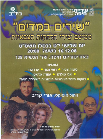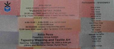 | Exhibits Israel art guide Haifa Art Museum, Check Post, The art of the 80s in Israel, mixed media, Adrenaline: presentation of young emerging artists: Orly Sever and Galia Pasternak Ein Harod Art Museum, Hegemony and Multiplicity, The art of the 50s in Israel, mixed media National Maritime Museum, Shikmona and its hidden treasures, antiquities and glass vessels, and antique objects recently discovered in the sea Tikotin Museum of Japanese Art, an exhibition of photographs by Zeev Alexandrowicz, Japan, 1934, and the Madness of Kites, kite-flying by Mikio Toki Beit Hagefen, Olive and Lycium, by Amnon Neuman, conceptual exhibition Museum of the City of Haifa exhibition: "Haifa 1948-1958, Dictionary of the city in the present" O * GE Gallery, Come fly with us (the butterflies) and Haifa, with love, Eco-car race, O * GE Gallery, HaNamal 35, Haifa On December 1, 26:00, Opening of the exhibition of paintings I am the son of Hagar, by Asad Azi, Oranim Academic College, Kyriat Tivon On December 4, Opening of the exhibition by the artist Yehudit Levine, Beit Yad LeBanim, Haifa On 5 December, Opening of the exhibition In the days of bare feet, paintings by Nira Lev, foyer, Auditorium, Haifa On December 6, Opening of the group exhibition Dream Window, by artists, Jews, Muslims and Christians, Beit Hagefen, Haifa On December 6, 19:00, Opening of the exhibition Mask and Portrait in Egypt at the Roman era, National Maritime Museum, Haifa On December 6, 11:30-13:00, Guided tours of the exhibition Check Post, Haifa Museum of Art On December 6, 11, 30, Festive City, back to the time when Haifa celebrated the Flower Festival, the day of the Sea, or the Silence operation, guided tour of the exhibition and workshops, Museum of the City of HaifaOn December 13, 11:30, Conversation in the galleries, National Maritime Museum, Haifa On December 13, 11:30-13:00, 5000 years of ancient navigation, National Maritime Museum, Haifa On December 13, 11:30-13:00, Guided tours of the exhibition Check Post, Haifa Museum of Art On Decemebr 19, Opening of the exhibit of quilts, Impressions from Africa, by Yemima Lavan, Seam Gallery, Megadim On December 19, 11:00, Opening of the exhibitions Vision and Myth, and Painted Fans, Tikotin Museum of Japanese Art, Haifa On December 20, 11:00, Guided tours of the exhibition Vision and Myth, and Painted fans , Tikotin Museum of Japanese Art, Haifa On December 20, 20:00, Opening of the group exhibit presented by Aviva Peres, Tapestry weaving and textile art, Yehudit Barak, Nirit Dror, Esther Vardi, Simha Zbeida, Herut Herpek, Irit Meir, Orna Magni, Tsvia Mandelbaum, Iris Menachem, Gonit Porat, Shoshana Paz, Ika Freund, Elka Kirshenbaum, Ilana Schwartz, Hana Shchori, Yehuda Shahar, Library and Memorial Center, Kyriat Tivon On December 25, 18:00, Opening of the exhibition of drawing Landscapes and faces, by Dorit Keidar Ress, Beit Yad LeBanim, Haifa On December 24, 11:30, Festive city, guided tour of the exhibition and workshops, Museum of the City of Haifa On December 27, 11, 00, Guided tours of exhibits, Tikotin Museum of Japanese Art, Haifa On December 27, 11:30, Guided tours of Haifa 1948-1958, City of the present, Museum of the City of Haifa Theater, Dance, Shows, Conferences On December 1, 10:30, Conference by Meirav Barack, It is another opera, opera as it appears in movies, Tikotin Museum of Japanese Art, Haifa On December 1, 19:30, Selected topics of Jewish thought, Conference of Gershon Bar Kochba, "בדמיך חיי" The dispute on the Mitpalelim path in Hebron, Community Center, Hadar, Haifa On December 1, 20:00, Personal travel in the footsteps of characters, Myriam and Moses, Conversations with Dov Elboim, Beit Abba Hushi, Haifa On December 1, 20:00, Judaism Study Group, Martef 10, Haifa On December 1, 20:30, Yakish and Poupche by Hanoch Levine, staged by Shimon Milman, produced by Gesher, Cultural Center, Yokneam On December 1, 22:00, Doors open by themselves, a tribute to Meir Ariel, the Beat, Haifa On December 2, 17:30, Israelis in Australia and New Zealand, conference by Israel Shani, College of Jewish Cultur, Haifae On December 2, 20:30, Children of a lesser God, by Marc Medoff, directed by Noya Lancet, produced by the Beer Sheva Municipal Theater, Kibbutz Yagur On December 2, 20:30, Yakish and Poupche by Hanoch Levine, staged by Shimon Milman, produced by Gesher, Cultural Center, Yokneam On December 2, 20:30, Othello by William Shakespeare, setting by Michael Gurevitz, Beit HaAm, Kfar Blum On December 3, 10:00, Senior Club, Conference by Nati Goldberg: Science, technology and hi-tech at the service of health, Community Center Neve Yosef, Haifa On December 3, 10:00, Uzi Tauber, Landscapes and 60 years of Israel, personal journey in the history of Israel, Beit Nagler On December 3 10:30, Greek Mythology in art, Zeus and Hera, the Olympic Family, conference by Dr. Effi Ziv, Tikotin Museum of Japanese Art, Haifa On December 3, 17:30, Dahlia Rabinowicz's poems, conference by Naomi Rottenberg, College of Jewish Culture, Haifa On December 3, 19:30, Selected topics of Jewish thought, the struggle between Yakov and Esau, Community Center, Hadar, Haifa On December 3, 20:00, Conference by Dr. Eyal Bar, bridges between cultures in Europe, Byzantine and Ottoman Istanbul, Beit Yad LeBanim, Haifa On December 3, 20:00, Literary Salon, Yochi Brandeis presents her latest book, Kings, Beit Abba Hushi, Haifa On December 3, 20:30, Concert of the Israel Philharmonic Orchestra, conducted by George Pehlivanian with Ingrid Fliter, pianist, Chopin, concerto no. 2 for piano, Prokofiev, symphony no. 5, auditorium, Haifa On December 3, 20:30, A woman like me, with Dorit Peled Hyam, Haifa Municipal Theater On December 3, 20:30, Yakish and Poupche by Hanoch Levine, staged by Shimon Milman, produced by Gesher, Cultural Center, Yokneam On December 3, 21:00, Was it a dream? Staged by Mazi Edna, directed by Omri Nitzan, produced by the Cameri, Kibbutz Kfar Menachem On December 3, 22:00, Dub LFO dub, re