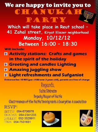 On December 8, 9 :00-17: 00, Hanukkah 2012 workshop, candles, chocolate donuts and honey bee observation, pygmy goats and pets, Shdemot Dvorah On December 8, 9:00, The heroes of light, A project in space, with Yuval HaMebulbal, Miki, Uncle Chaim, Yad LeMeginim, Kibbutz Yagur On December 8, -10:00, Holiday of Holidays, for children and the whole family, see details below “For adults”, Wadi Nisnas, Haifa On December 8, 10:00, Chanukah at Madatech, Professor Light show, demonstrations on light, shadow of a story, legends in lights and shadows, exhibitions, jewels by Professor Schechtman, National Museum of Science, Technion historical building, Haifa On December 8, 10 00, Hanukkah at the Manara rock, Calling birds, guided tours and observation of the migration, and creative workshops on ecology, Kiryat Shmona On December 8, 10 :30-14: 00, Handicraft studio, Kirigami and carvings, 11: 00, Guided visit of the galleries, Tikotin Museum of Japanese Art, Haifa On December 8, 11:30, The heroes of light, A project in space, with Yuval HaMebulbal, Miki, Uncle Chaim, Yad LeMeginim, Kibbutz Yagur On December 8, 11 :30-13: 00, The young architect, Workshop inspired by the exhibit On the way to the sea, architecture between the Carmel and the coast, Haifa City Museum On December 8, 12 00, Clowns seek meaning, by Roe Biran, Hamila Theatre, Kibbutz Harduf On December 8, 12 30, Berale Kids, Magic Mystery Tours, Beatles songs for the whole family, Berale, Kibbutz Lehavot Haviva On December 8, 16:00, The heroes of light, A project in space, with Yuval HaMebulbal, Miki, Uncle Chaim, Yad LeMeginim, Kibbutz Yagur On December 8, 16:30, Avner, the strange, acrobatics, magic, mime etc ... Motzkin Theatre , Kiryat Motzkin On December 8, 18:30, The heroes of light, A project in space, with Yuval HaMebulbal, Miki, Uncle Chaim, Yad LeMeginim, Kibbutz Yagur