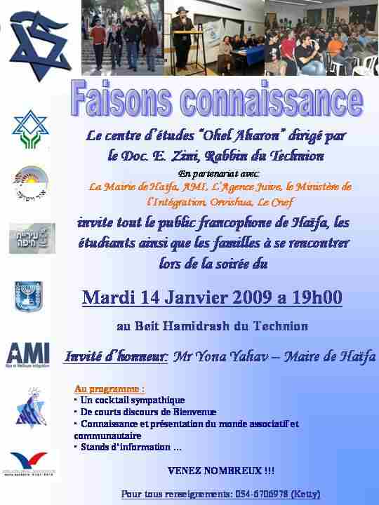 | Expositions Les musees de Haifa Musee d'Art de Haifa, de nouvelles expositions, du 24 janvier au 20 juin, Esthetique de la violence Dans le cadre de l'Annee de la Pologne, parainnee par l'Institut Adam Mickiewicz, le Ministere des Affaires etrangeres et le Ministere de la Culture et de l'Heritage National de Pologne -Jeux de Force, mixed media, exposition d'artistes Polonais, Hubert Czerepok, Zuzanna Janin, Grzegorz Klaman, Norman Leto, Janek Simon, Artur Zmijewski. -Histoire de la violence, curateur Hadas Maor, avec les artistes Lida Abdul, Yael Bartana, Tali Ben Bassat, Avner Ben Gal, Gilad Efrat, Mona Hatoum, Michal Heiman, Lea Golda Holterman, Grzegorz Klaman, Sigalit Landau, Ernesto Neto, Chloe Piene, SUPERM: Slava Mogutin and Brian Kenny, Naama Tsabar, Artur Żmijewski -Expositions solo: 3 artistes d'Europe de l'Est: Biljana Ðurđević de Serbie, Norbert Bisky d'Allemagne, le groupe AES+F de Russie 3 artistes d'Israel, Eddo Stern, (Ami) Faytchevitz et Tal Frank Yiddishkeit, a partir du 29 janvier, exposition d'illustrations d'histoires de Shalom Aleichem, lithographies de Mane Katz et de Anatoli Kaplan, musee Mane Katz Musee National de la Marine, Shikmona et ses tresors caches, et des recipients de verre, et des objets recemment decouverts dans la mer Exposition Haifa 1948-1958, Dictionnaire de la ville du present, Musee de la Ville de Haifa Galerie O*GE , du 30 janvier au 28 mars, La Voix de Haifa, Photographies de presentateurs de Radio Haifa, HaNamal 35, Haifa Le 1er decembre, Vernissage de l'exposition de peintures Je suis le fils de Hagar de Asad Azi, College Academique Oranim Le 4 decembre, Vernissage de l'exposition de l'artiste Yehudit Levine, Beit Yad LeBanim, Haifa Le 6 decembre, 19:00, Vernissage de l'exposition Masque et Portrait en Egypte de l'ere Romaine, Musee Maritime National, Haifa Le 19 decembre, 11:00, Vernissage de l'exposition Vision du Mythe et Eventails Peints, Musee Tikotin d'Art Japonais, Haifa Le 3 janvier, 18:00, Vernissage de l'exposition Les couleurs de la vie, de Liana Ben Itzhak, jusqu'au 23 janvier, Centre Culturel Français, Haifa Le 6 janvier, 17:00, Vernissage de l'exposition de peintures de Sophie Younes, jusqu'au 31 janvier, Mairie de St Jean d'Acre Le 10 janvier, 12:00, Vernissage des exposition de Mark Yudell et Yifa Adir, Conversation avec les temps anciens, sculptures, et Bleu de Anat Berger, peintures, Musee Wilfrid Israel, Kibbutz HaZorea Le 11 janvier, 13:00, A la premiere personne, sculptures de Mirit Cohen Caspi, Centre Goran pour les Arts, College Academique de la Vallee de Jezreel Le 13 janvier, 18:00, Vernissage de l'exposition Tolerance, exposition collective de jeunes peintres de Ramallah, Entree libre, Centre Culturel Francais, Nazareth Le 15 janvier, 18:00, Vernissage de l'exposition de peintures de Michal Zigelman, Beit Yad LeBanim Le 17 janvier, 11:30, Visite guidee des expositions, Musee Maritime National Le 17 janvier, 17:30, Vernissage de l'exposition Stirrings, de l'artiste Abbey Rotbart, jusqu'au 14 fevrier, Galerie d'art Karo Le 17 janvier, Vernissage de Souvenir, exposition de groupe, mixed media, Centre Yigal Alon, Kibbutz Ginosar Le 24 janvier, 11:30,Visite guidee de l'exposition Haifa 1948-1958, Musee de la Ville de Haifa Le 24 janvier, 12:00, Vernissage de l'exposition, Portraits en passant, portraits de soldats, de Yitshak Yarkoni, Gelerie d'artistes d'Ein Hod Le 24 janvier, 13:00, Vernissage de l'exposition En depit de tout de Idan Erez, Galeire de Cabri, Kibbutz Cabri Le 24 janvier, 20:30, Vernissage de l'exposition Esthetique de la Violence, -voir ci- dessus, Musee d'Art de Haifa Le 26 janvier, 16:00, Vernissage de l'exposition de peintures, Vera Icône, de Joshua Borkovsky, College Academique Oranim, Kyriat Tivon Le 31 janvier, 19:00, Vernissage de l'exposition Artlana, de Arthur Astman et Ilana Bellahsen, Centre Culturel Francais, Haifa Spectacles, conferences, rencontres, culture Du 1 au 3 janvier, Week-end musical au Pastoral, Le genie de Salzbourg, Perles de Mozart, avec l'Orchestre de Chambre du Kibbutz, les derniers operas de Mozart, Hautbois, piano et cordes, Hotel Pastoral, Kfar Blum Le 1er janvier, 10:30, Conference du Dr Ruthie Director, L'espace de presentation de l'art moderne, Musee d'Art de Haifa Le 1er janvier, 20:30, Hamlet de William Shakespeare, mise en scene de Omri Nitsan, produit par le Cameri, Theatre Municipal de Haifa Le 1er janvier, 20:30, Boaz Sharabi, Berale, Kibbutz Lehavot Haviva Le 1er janvier, 22:00, Miri Messika, the Beat, Haifa Le 2 janvier, 11:00, Le piano raconte, La miniature, une petite histoire musicale, par Irena Friedlander, Musee Tikotin d'Art Japonais, Haifa Le 2 janvier, 22:00, Alma Kalma, Samba hebraique originale, avec la chanteuse Michal Lotan, Martef 10, Haifa Le 2 janvier, 22:30, Rami Vered, Stand-up, Beit Nagler, Kyriat Haim Le 2 janvier, 22:00, Groupe de chant, (le public chante aussi), Musique Grecque, avec Gila Hassid, chant et piano, Uzi Rosenblatt, accordֳ©on, Lazar Bueno, chant Le 2 janvier, 22:30, Dan Toren, acoustic, Bar de Doris, Kibbutz Afikim Le 3 janvier, 10:30, Quintets de piano, Mozart et Beethoven, Einav Yarden, piano, Roni Gal Ed, hautbois, Kibbutz Ein HaShofet Le 3 janvier, 11:00-15:00, 11:00-15:00, Danses folkloriques et en rang sur la plage, Promenades Naot et Dado Le 3 janvier, 11:00, Maniah Herman a l'occasion de la sortie de l'album Enfance coupee, presentation de Shlomo Davis, Beit Hanna Hushi, Haifa Le 3 janvier, 12:00, Seulement Mozart, Concerto pour flute et harpe, et Exultate Jubilate, Maria Yoffe, soprane, Eyal Ein Habar, flute, Julie Rubinsky, et l'Orchestre des Festivals, Eglise St John, Haifa Le 3 janvier, 17:00 et 21:00, Classique sur mesure, conference concert du Dr Estherit Baltsan, Ravel, entre deux peuples, avec des musiciens de l'Orchestre Philharmonique d'Israel, et les danseurs de flamenco Edwin Apparicio et Carmel Sheli, auditorium Rappopor, Haifa Le 3 janvier, 19:30, Groupe de danse avec le duo Latino, Centre Communa