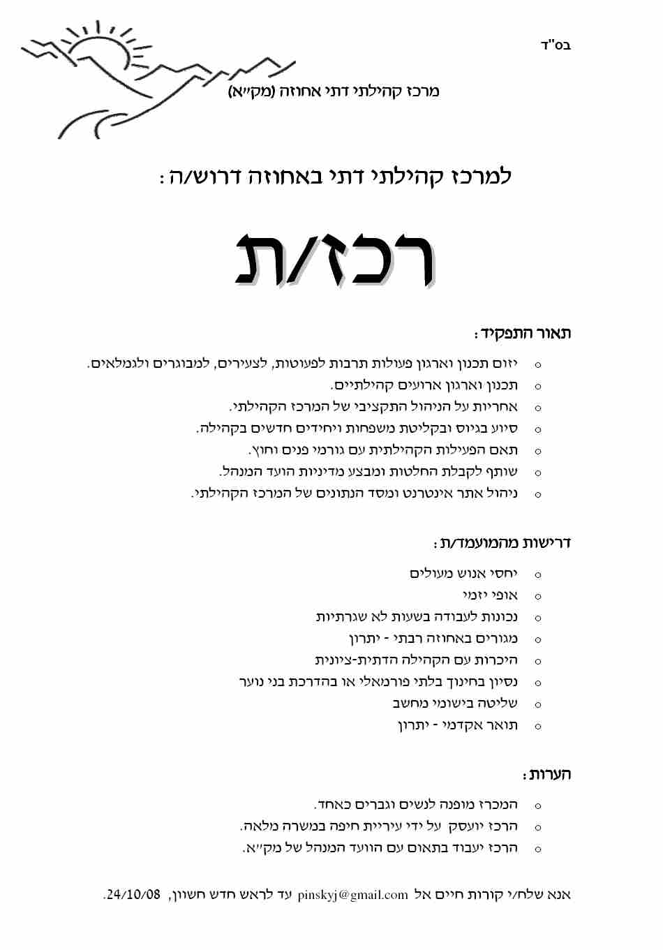 Les personnes interessées pourront envoyer leur candidature et leur CV en hébreu ou en