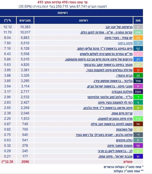 Yona Yahav Thora Shas Union Yesh Atid Haifa Beitenu Haim BeHaifa Einat Kalish Rotem Hadash Yerukim Green Verts Change Yaakov Borowski Seniors HaBayit HaYehudi Likud Shimshin Ido Haifa Lovers Amoureux de Haifa Israel Savion Emet Avoda Labour Balad New Haifa Itai Gilboa Kyriat Haim 1 Meretz Tikva LeHaifa Zeev Sils Kol HaSchunot Voix des quartiers Voice of districts Shlomo Gilboa Kulanu Haifaim All Haifa residents Tous Haifaouis Moatsa Toshavei Haifa Council of Haifa residents Lev Heart Coeur Leon Ben Margi Ahavat Israel Haifa 1, Love of Israel Amour d'Israel